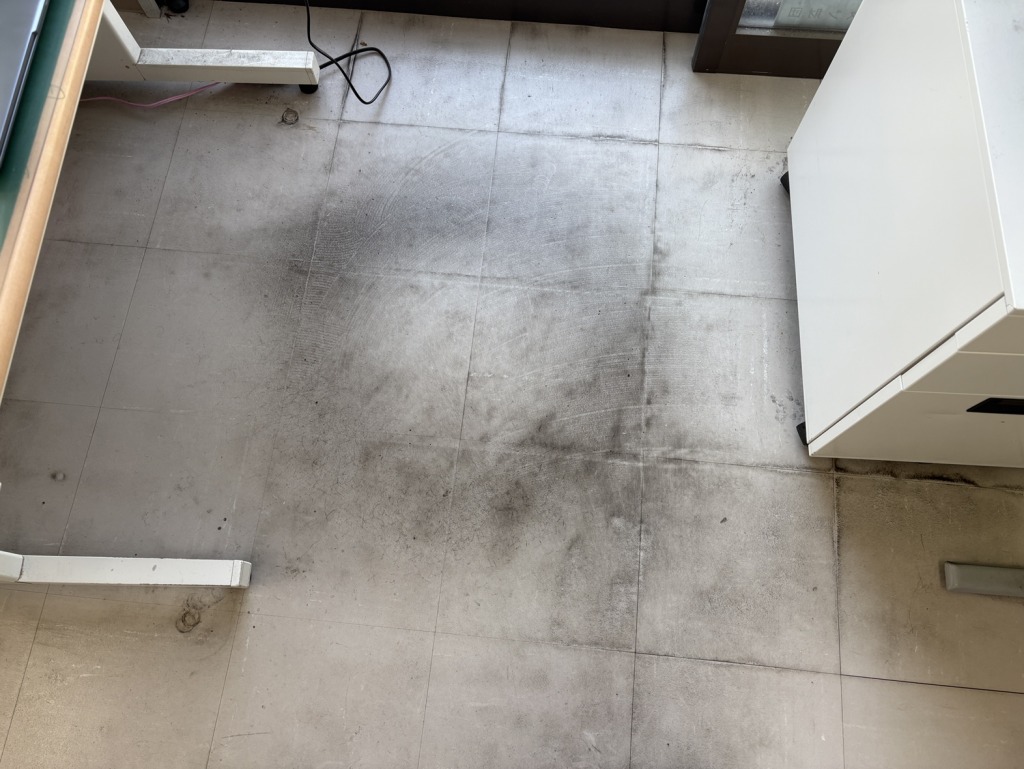 こちらがクリーニング前の施設内の床の状態です。特に人通りの多い箇所や、複合機、デスク周りには、汚れや黒ずみが目立っていました 。