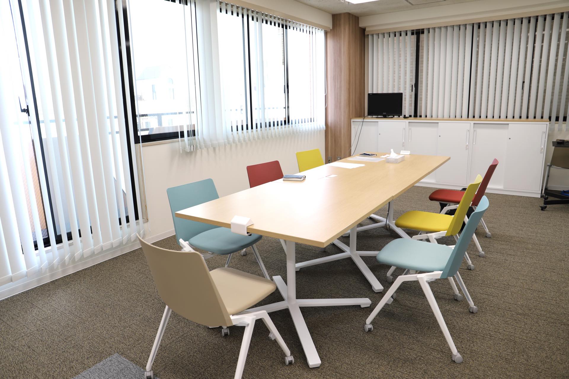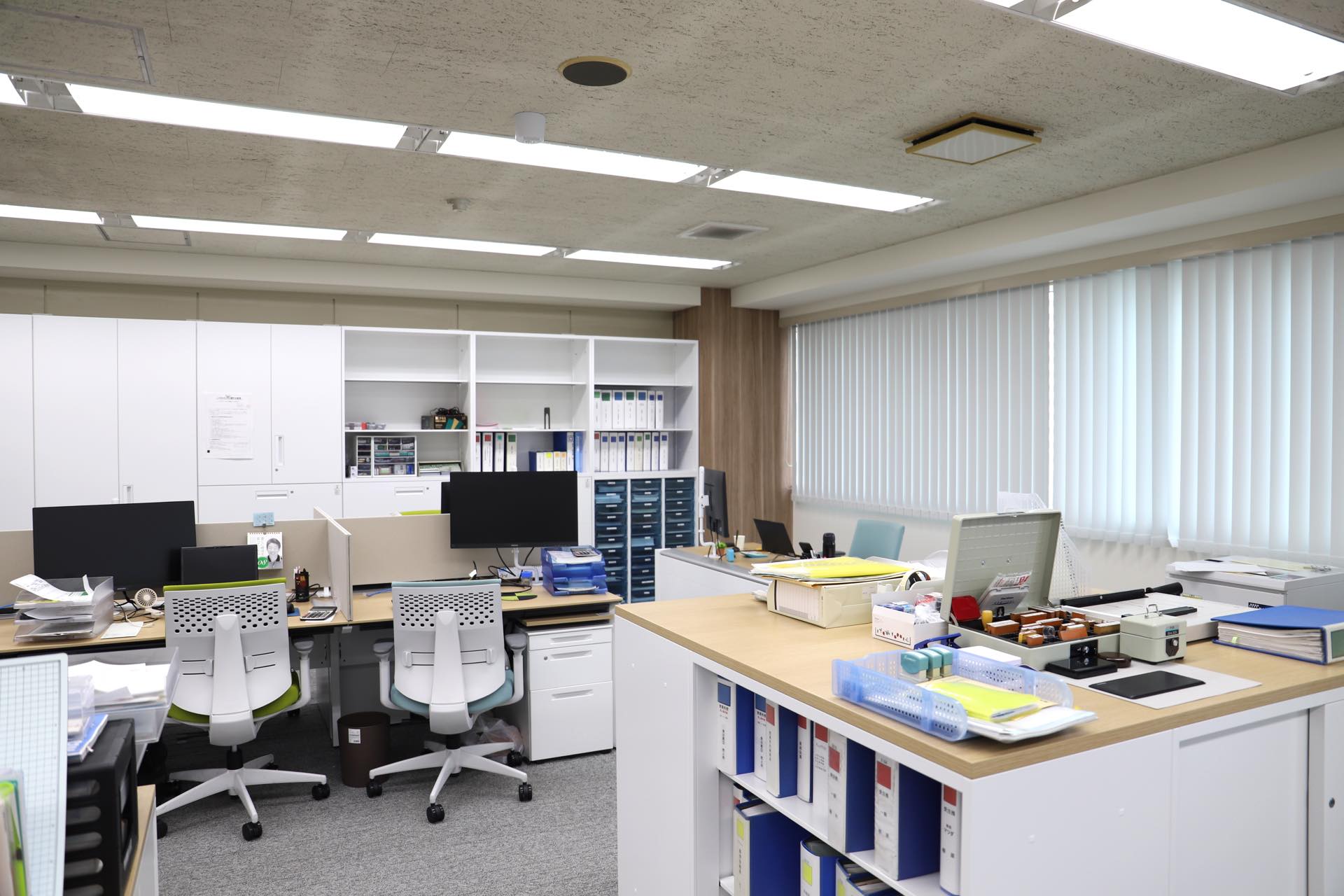 今回の工事では、蛍光灯からLEDへの照明交換をはじめ、間仕切り・壁クロス・カーペットの張り替え・ブラインド設置といった内装工事を実施。また、保管庫の入れ替えやシュレッダーの更新に加え、机・椅子などの什器一式を新たに導入いただきました。